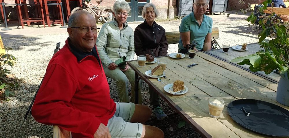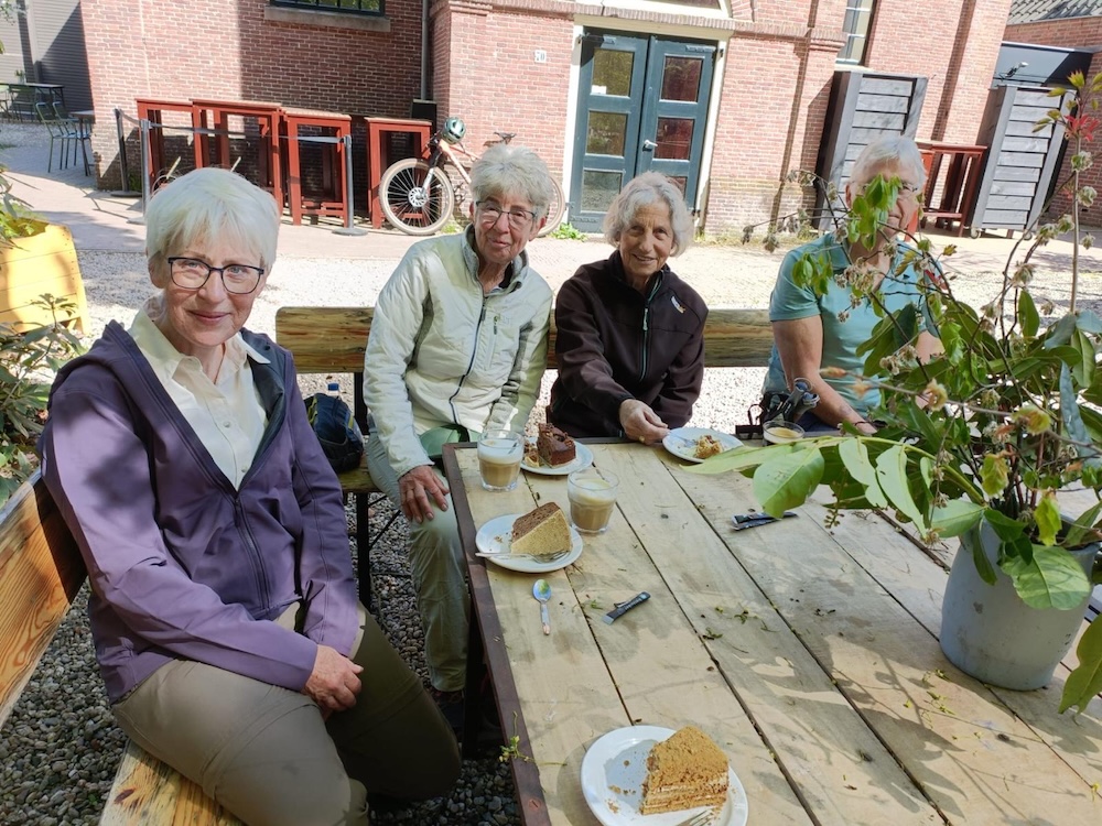 Harrie hield een flink tempo aan, zodat we al om 11.30 met zweetpareltjes op ons voorhoofd in het Beauforthuis aan de cappuccino zaten. De keuze aan taart deed onze hoofden nog meer duizelen en uiteindelijk hadden we ieder een ander stuk taart. De appeltaart – met of zonder slagroom – was behoorlijk favoriet, maar ook walnoten dadeltaart en notentaart met honing waren bijzonder in trek.